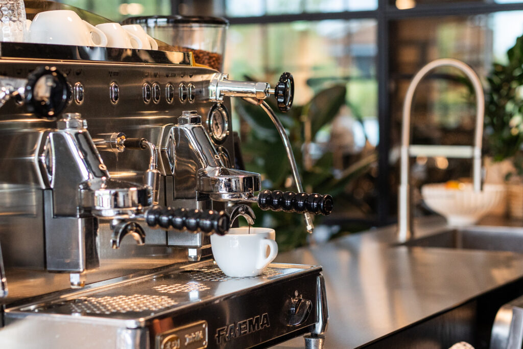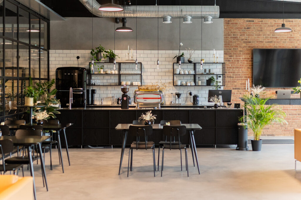 En rymlig lounge värdig lobbyn i ett boutiquehotel med stora industrifönster, bekväma soffor, fåtöljer och en braskamin. I vårt café kan du beställa riktigt gott kaffe (vi erbjuder både kaffelatte, cappuccino och espresso) och givetvis te. Framöver planerar vi att erbjuda mer matiga alternativ. På vår stora uteplats kan du avnjuta en kaffe samtidigt som du njuter av solen och kopplar av. Vi har skapat en urban oas för träning, avkoppling, social interaktion och kreativt arbete.